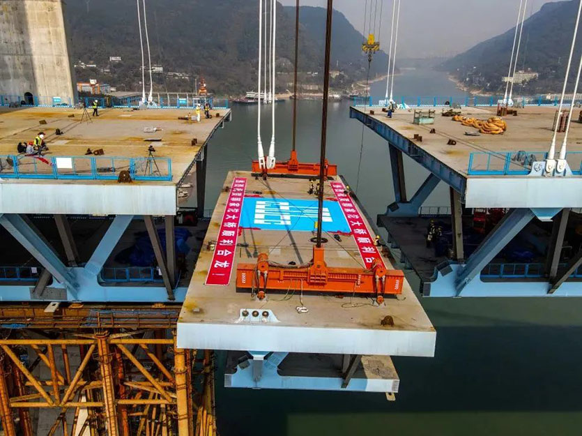 3月15日上午,隨著最后一塊鋼桁梁的成功吊裝,國內(nèi)最大跨度公軌兩用懸索橋——郭家沱長江大橋成功合龍,預(yù)計今年內(nèi)將具備通車條件。由正景機械研制的四臺橋上單邊施工車有幸參與這一歷史時刻。